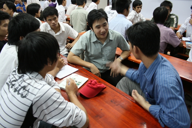 Bạn Nguyễn Văn Sơn - mặc áo màu xanh - là một trong những thành viên tích cực vận động mọi người tham gia và thành lập CLB Ngoại Ngữ