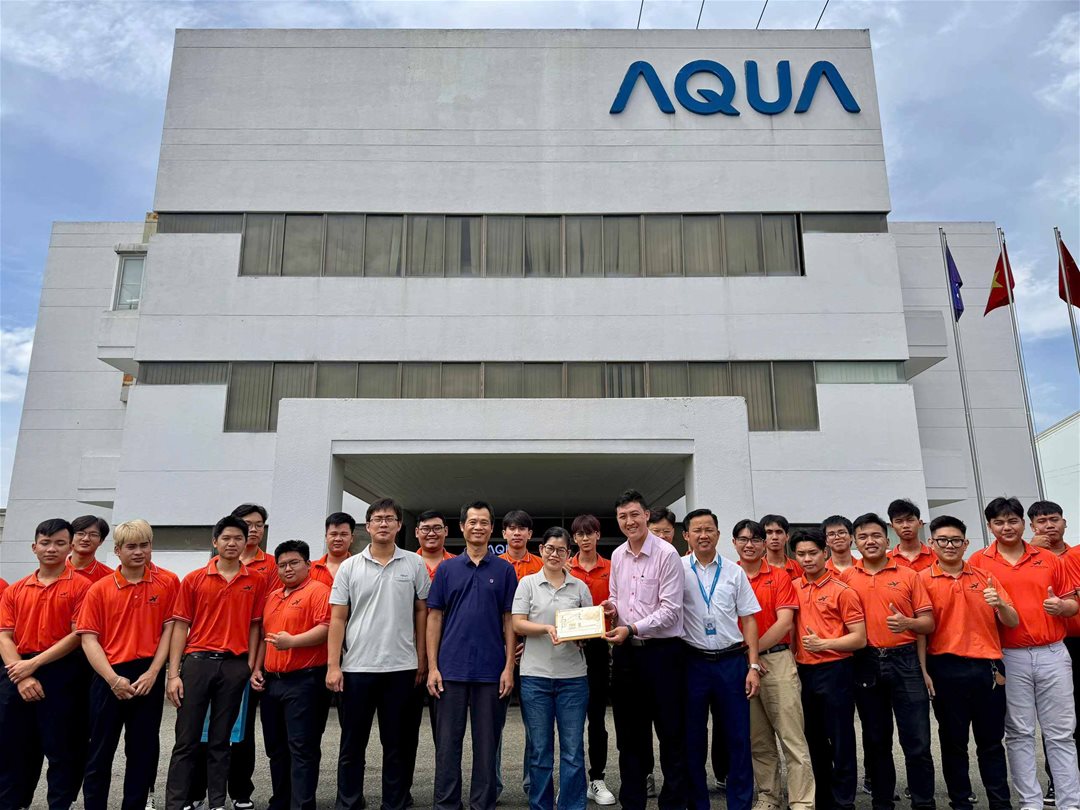 Tại buổi tham quan, sinh viên được đại diện công ty giới thiệu tổng quan về lịch sử hình thành và phát triển của thương hiệu AQUA, một trong những doanh nghiệp điện tử hàng đầu Việt Nam, thuộc tập đoàn Haier Group . Với hơn 25 năm hoạt động tại Việt Nam, AQUA đã không ngừng mở rộng quy mô sản xuất, khẳng định vị thế thương hiệu thông qua các sản phẩm gia dụng chất lượng cao như tủ lạnh, máy giặt, máy điều hòa và nhiều dòng sản phẩm điện tử tiên tiến khác, đáp ứng tiêu chuẩn quốc tế.