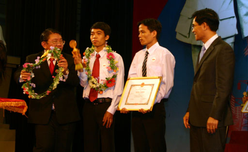 Sinh viên Hồ Tạ Quyền - Mai Văn Hùng nhận bằng khen và cúp (giải nhất)
