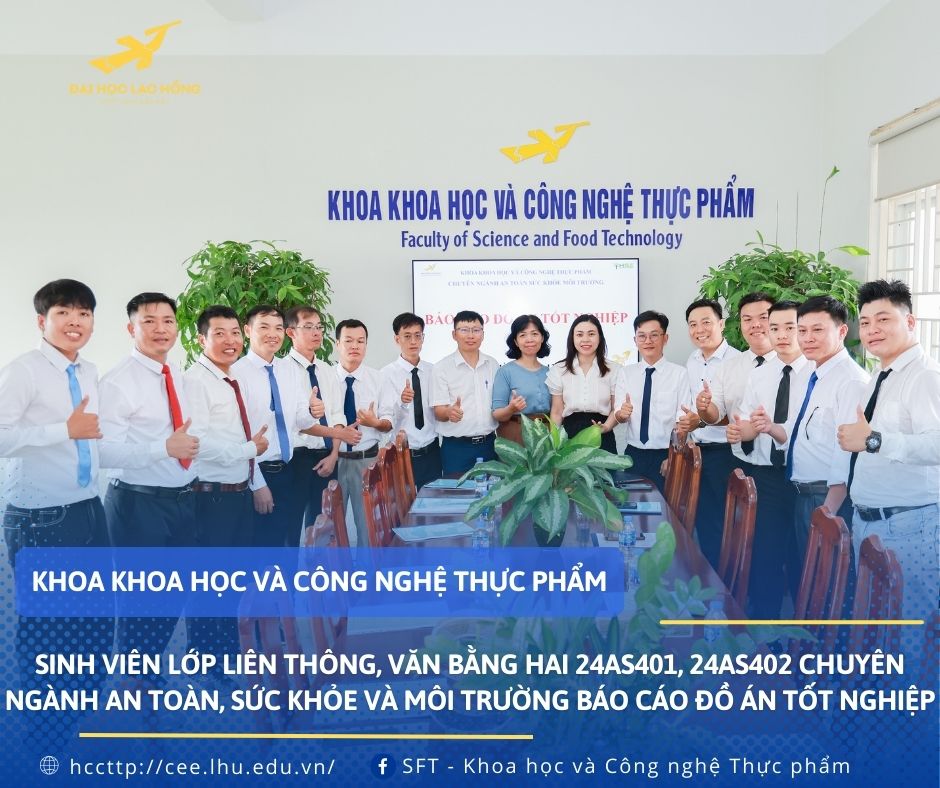 Ngày 13/12/2025 tại phòng I 408, Khoa Khoa học và Công nghệ Thực phẩm đã tổ chức buổi báo cáo đồ án tốt nghiệp cho các lớp 24AS401, 24AS402 hệ liên thông, văn bằng hai chuyên ngành An toàn, Sức khỏe và Môi trường. Đây không chỉ là dấu mốc quan trọng khép lại hành trình học tập miệt mài của các học viên, mà còn là dịp khẳng định chất lượng đào tạo và định hướng gắn kết chặt chẽ giữa lý thuyết và thực tiễn của Khoa.