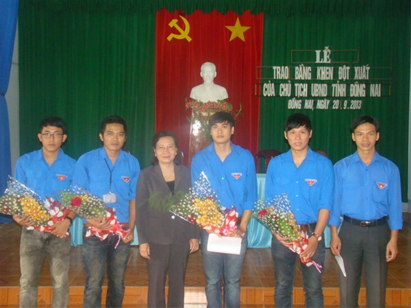 Hình 1: Ông Lê Mai Thanh (giữa) trao bằng khen của UBND Tỉnh Đồng Nai cho các em sinh viên
