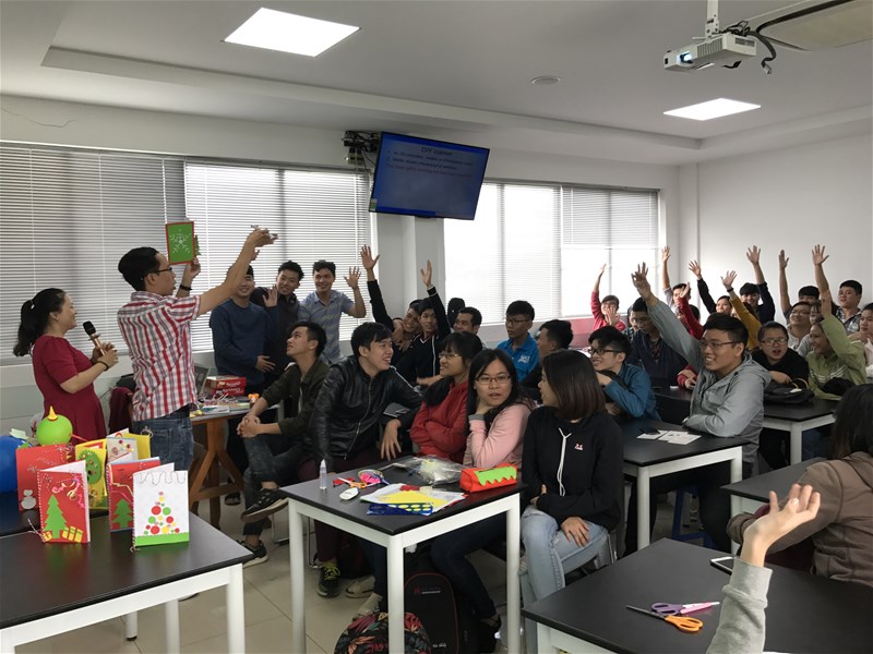 The first activity named “Christmas ice-breaker” was a good chance for attendees to go around classroom and make friends. During the meeting, questions about Christmas fun facts brought the students gifts, laughter and most importantly, reading skills and Christmas-related knowledge.  Last but not least, DIY activity did bring students together to design their own Christmas cards, along with the familiar melodies of Christmas songs. Not only did they become involved enthusiastically in team work but they also confidently presented their Christmas messages and thoughtful wishes to other attendees.