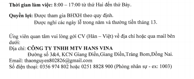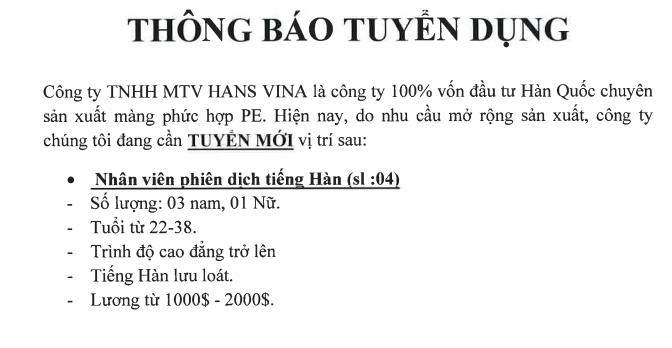 Công ty Hans Việt Nam cần tuyển phiên dịch tiếng Hàn