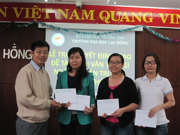 Căn cứ kết quả đánh giá của hội đồng từ buổi định hướng đề tài, vào ngày 28/12/2013, tại phòng B203 Trường đã tổ chức buổi lễ trao quyết định giao đề tài cho 24 học viên đã có kết quả đạt từ buổi định hướng. TS. Nguyễn Văn Tân - Trưởng phòng Sau đại học, kiêm Trưởng khoa Quản trị - Kinh tế quốc tế đã thay mặt Nhà trường trao quyết định giao đề tài cho các học viên nói trên.