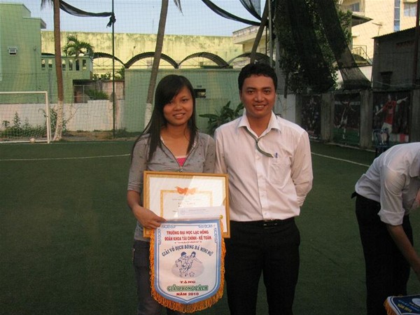 Đồng chí Phan Thành Nam - Bí thư Đoàn khoa TC-KT trao giải Thủ môn xuất sắc nhất
