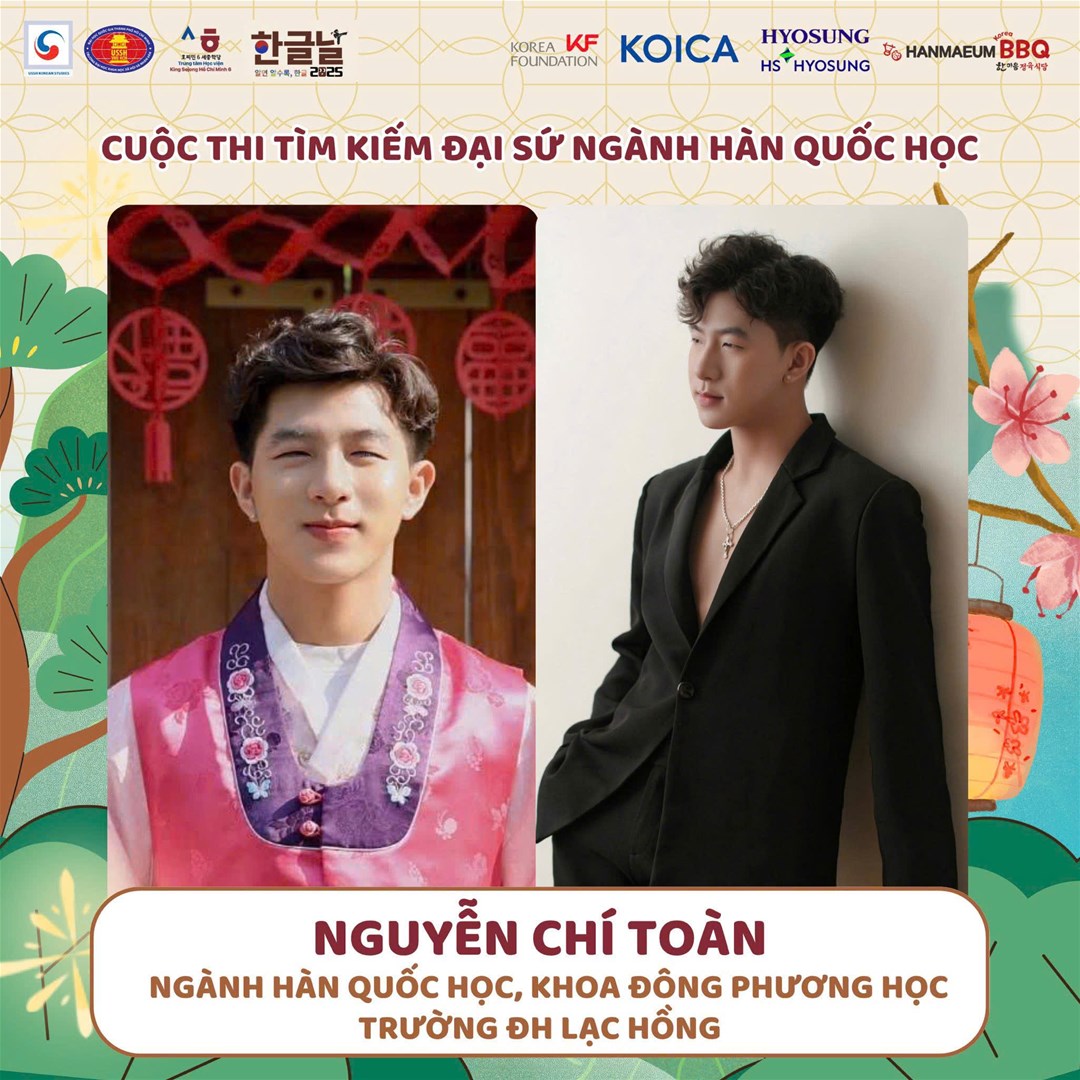 Với phong thái tự tin, khả năng giao tiếp tiếng Hàn linh hoạt cùng vốn kiến thức vững vàng về văn hóa Hàn Quốc, Nguyễn Chí Toàn – sinh viên năm 4 Ngành Hàn Quốc học, Trường Đại học Lạc Hồng – đã xuất sắc đạt thành tích Top 5 Nam sinh xuất sắc nhất tại Cuộc thi “Đại sứ Hàn Quốc học Miền Nam 2025” thuộc khuôn khổ Hangeul Festival 2025.
