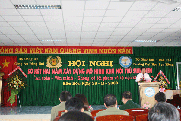 Phát biểu chỉ đạo tại Hội nghị, Thượng tá Huỳnh Ngọc Phương – Phó cục trưởng X28 Bộ Công an nhiệt liệt hoan nghênh hoạt động đào tạo kết hợp với bảo vệ an ninh trật tự của nhà trường. Thượng tá cũng nhất trí với năm bài học kinh nghiệm nhà trường đúc kết sau hai năm thực hiện mô hình và mong rằng Trường Đại học Lạc Hồng sẽ thực hiện tốt hơn nữa phương hướng và nhiệm vụ trong hai năm tới. Đại diện Bộ Giáo dục và Đào tạo, TS Đỗ Quốc Anh hoan nghênh sự chỉ đạo của Bộ Công an cho Công an tỉnh Đồng Nai phối hợp với trường Đại học Lạc Hồng xây dựng mô hình Khu nội trú sinh viên “An toàn – Văn minh – Không có tội phạm và tệ nạn xã hội”. Trong những năm tới Nhà trường cần phối hợp chặt chẽ với các lực lượng an ninh đào tạo và giáo dục sinh viên trở thành lực lượng nòng cốt trong công tác phòng chống tội phạm xã hội.