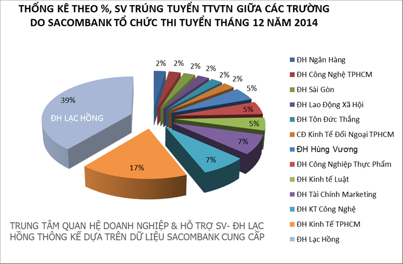 2 năm liên tiếp sinh viên Đại học Lạc Hồng đã xuất sắc trúng tuyển với tỷ lệ cao nhất trong chương trình “Tuyển dụng thực tập viên tiềm năng Sacombank” do Ngân hàng Thương mại Cổ phần Sài Gòn Thương Tín (Ngân hàng Sacombank) phối hợp tổ chức tại 13 trường đại học trong khu vực Đông Nam Bộ. Qua chương trình “Tuyển dụng thực tập viên tiềm năng Sacombank 2015”, với tổng chỉ tiêu 41 sinh viên năm cuối đến từ các trường Đại học đào tạo Ngành Tài chính Ngân hàng cùng tham gia tuyển chọn. Sinh viên Đại học Lạc Hồng trúng tuyển 16/41 thí sinh (tương đương 39%), vị trí thứ 2 là Đại học Kinh tế - 7/41 sinh viên (chiếm 17%), tiếp theo đó là Đại học Kinh tế Công nghệ và Đại học Tài chính Maketing (7%)...