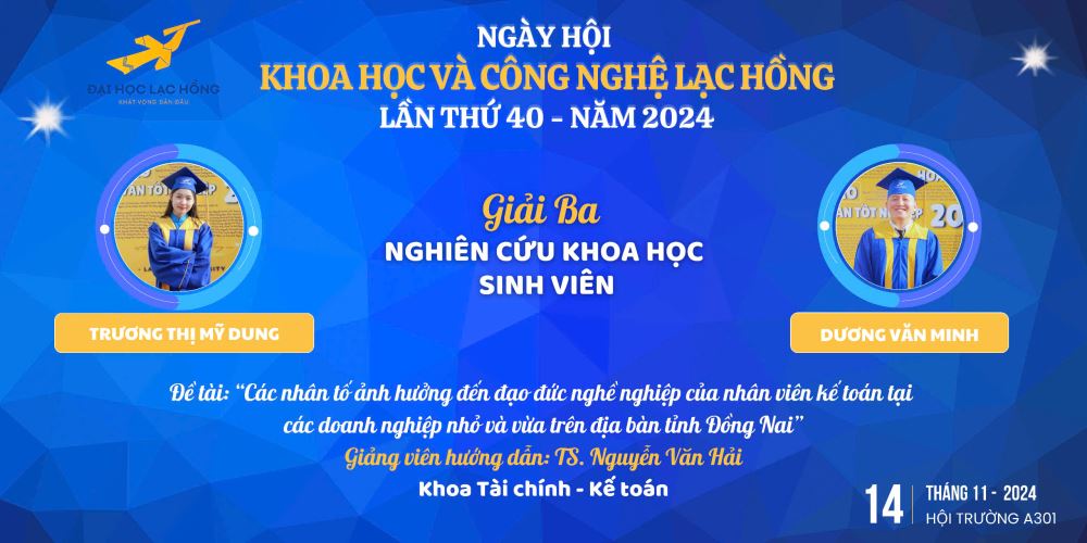 The student group consisting of Vo Thi Thuy An and Phan Thi Thuy Linh achieved First Prize with their project titled: "Factors Influencing the Decision to Use Accounting Services in Small and Medium Enterprises in Bà Rịa - Vũng Tàu Province." Under the guidance of MSc. Lam Ngoc Nhan, the group conducted a detailed analysis of key factors driving the use of accounting services in small and medium enterprises and proposed practical solutions to enhance business efficiency. This achievement not only highlights the scientific research capabilities of the students but also opens up new perspectives on the field of accounting in the region.