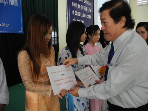 People's Teacher Dr. Do Huu Tai on behalf of Mrs Le Thi Tru awards scholarships to the receivers.