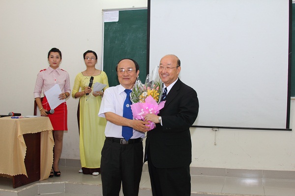On behalf of the University Management Board, Vice Rector Dr. Diep Cam Thu present flowers to the speaker Mr. Fumio Okita.
