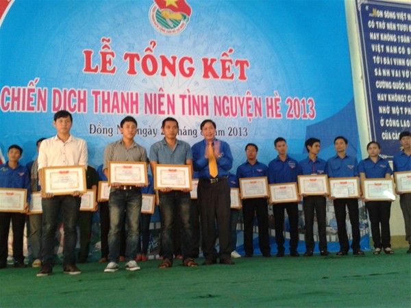 The same day's afternoon, at 14:00 p.m, LHU voluntary youth members together with 800 young people of other units gathered at Dong Nai University to attend the closing ceremony of 2013 Green Summer Campaign. At the closing ceremony, Dong Nai provincial Youth Union Standing Committee presented certificates of merit to LHU collective and two individuals including team leader Huynh Thuc Hieu and deputy leader Nguyen Ca Thuan.