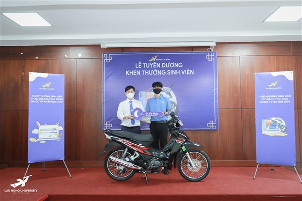 On behalf of LHU, Rector Lam Thanh Hien awarded First prize as a motorbike to the winner of the high school trial competition held by LHU