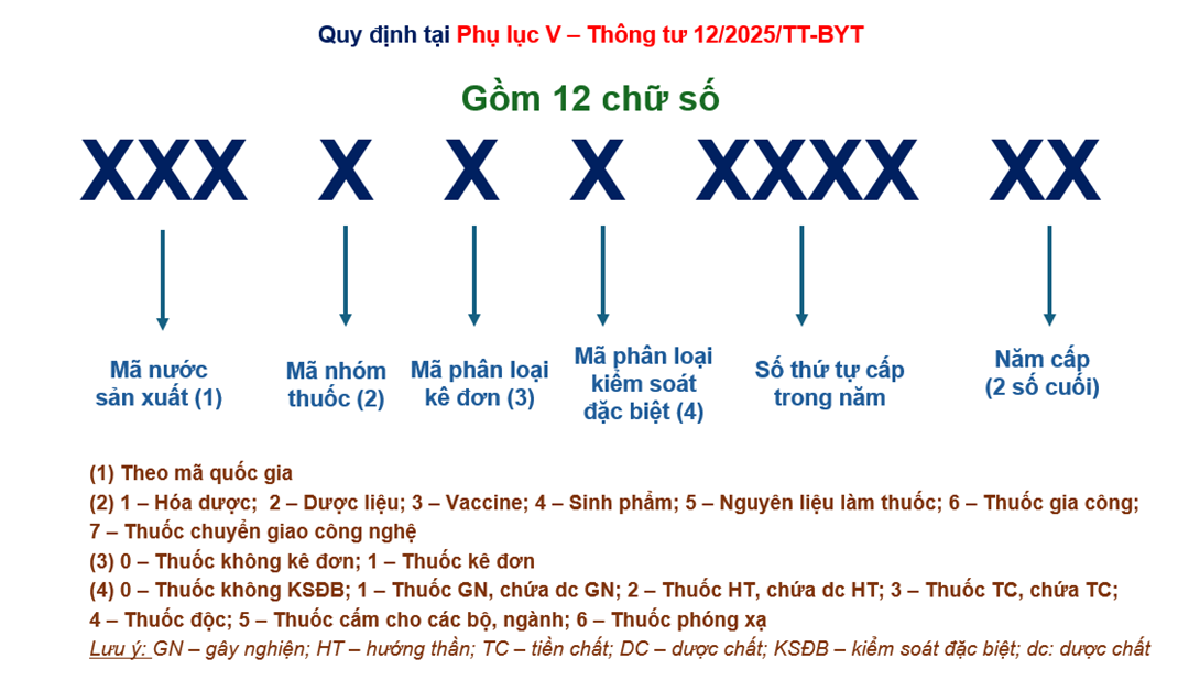 Theo quy định tại Phụ lục V – Thông tư 12/2025/TT-BYT, mỗi thuốc lưu hành tại Việt Nam đều có Số đăng ký gồm 12 chữ số với ý nghĩa rõ ràng: