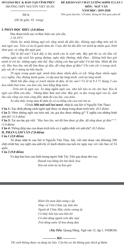 2. Đề thi thử THPT Quốc gia năm 2020 môn Ngữ văn trường THPT Nguyễn Viết Xuân - Vĩnh Phúc