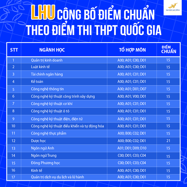 Trường Đại học Lạc Hồng chính thức công bố điểm trúng tuyển theo phương thức xét tuyển dựa trên kết quả thi tốt nghiệp THPT năm 2020, theo đó điểm trúng tuyển của thí sinh có điểm thi THPT theo tổ hợp môn là 15 điểm với tất cả các ngành. Riêng  ngành Dược học 21 điểm, Cụ thể xét tuyển theo từng ngành như sau: